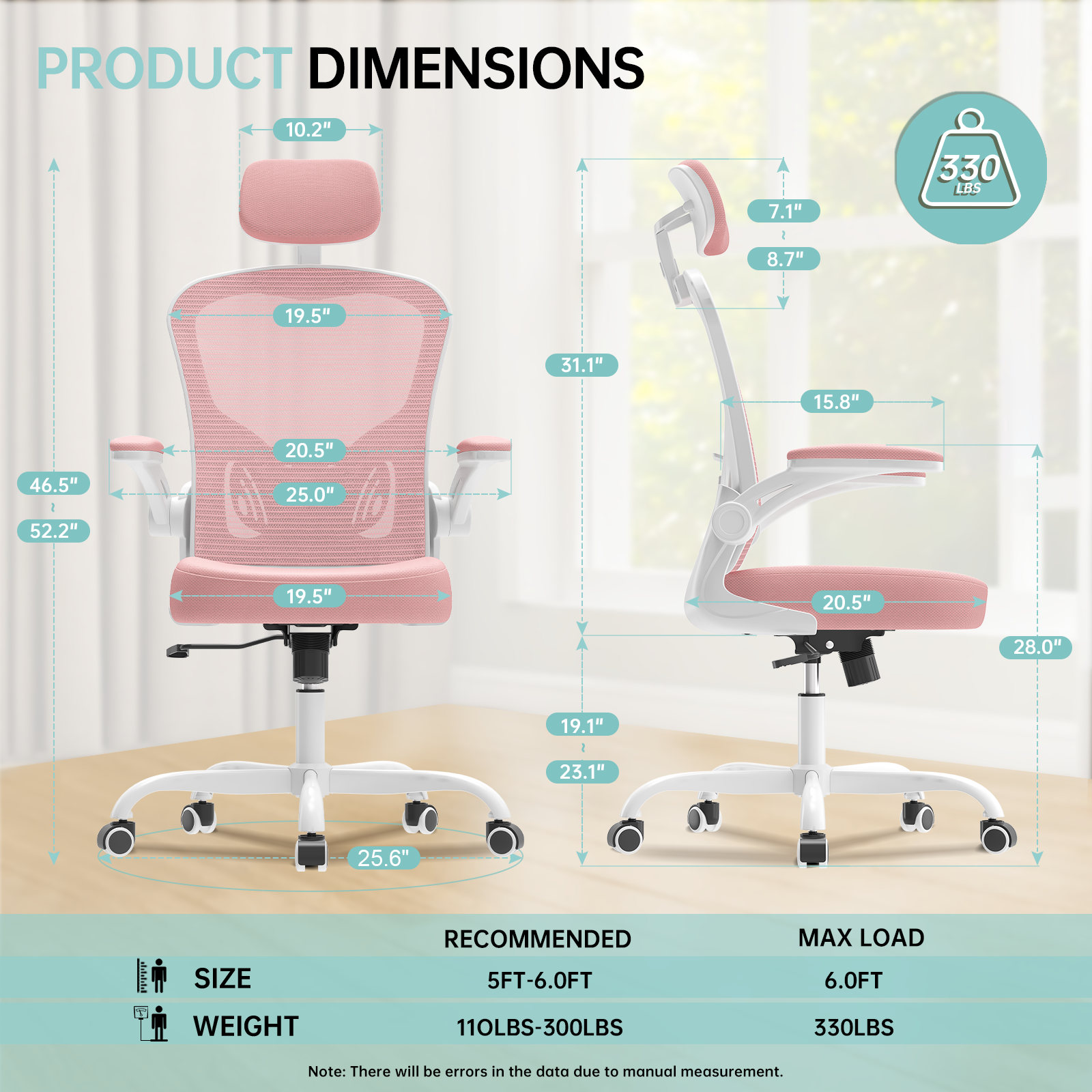 - Comfortable Breathable Mesh Chairs: This office desk chair with 20.5"*20.5" breathable mesh backrest, 3.1" thick cushion offers a spacious seating area, accommodating various body types, accommodates heights from 5'0" to 6'0". Overall dimensions (including arms): 25.5“ W x 23.2“ D x 48.2“-53.2“ H. Its unique recline function allows you to tilt the backrest (90~135°), bring your comfort and relaxation.