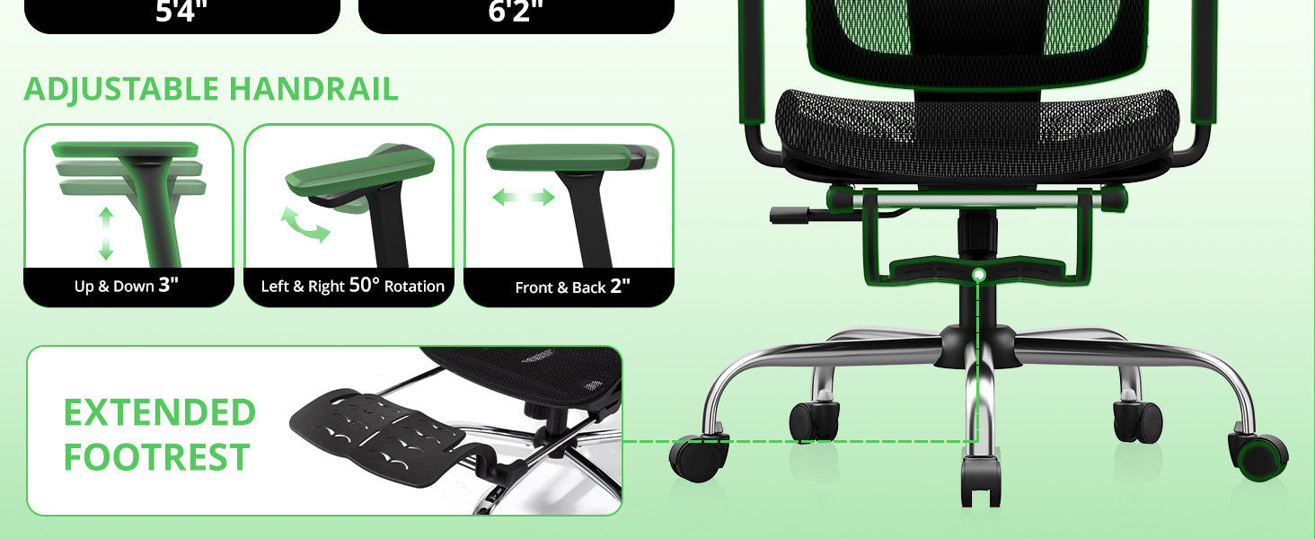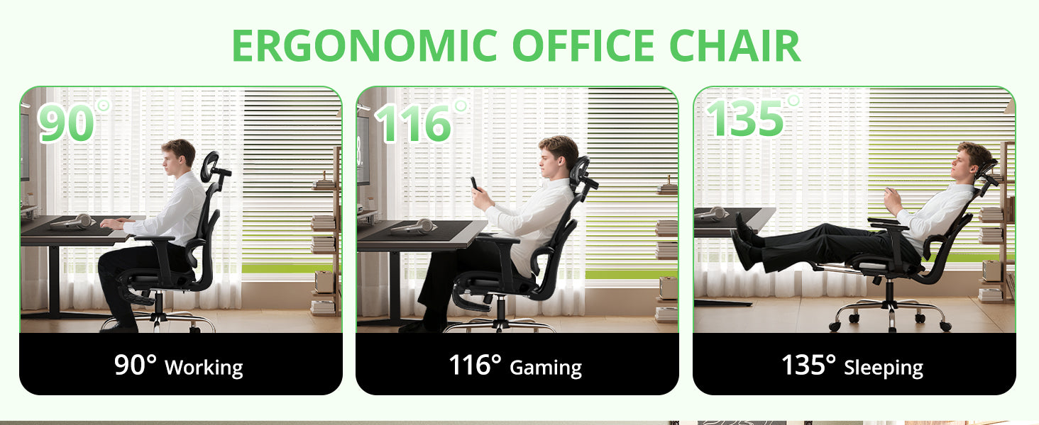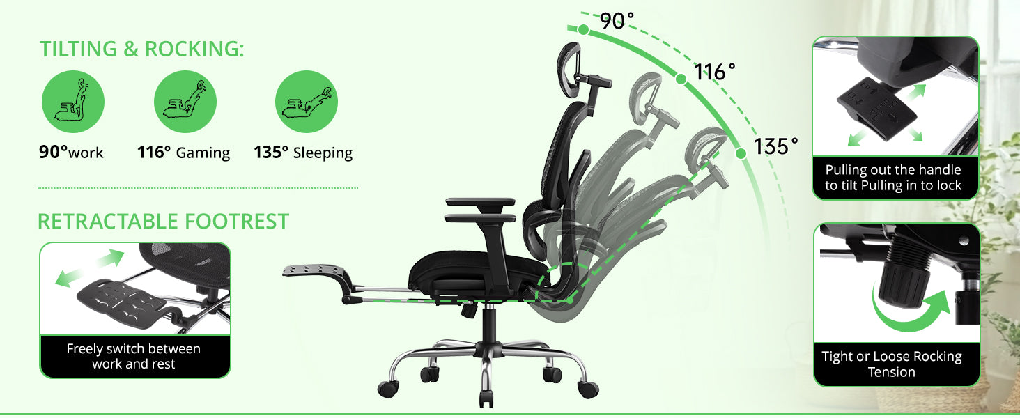 - 135° RECLINE WITH RETRACTABLE FOOTREST : Lean back for relaxation between tasks. The reclining backrest and extendable footrest make it ideal for stretching, reading, or quick power naps in your home office.